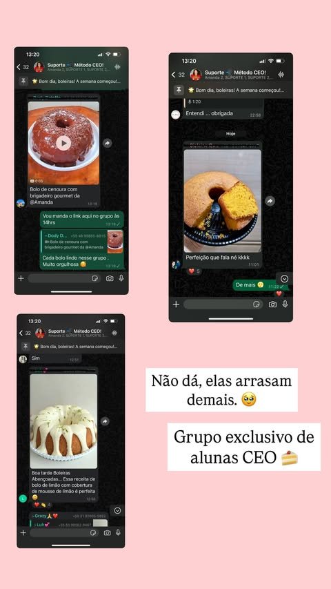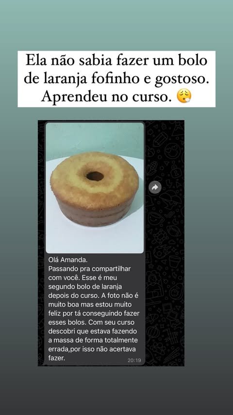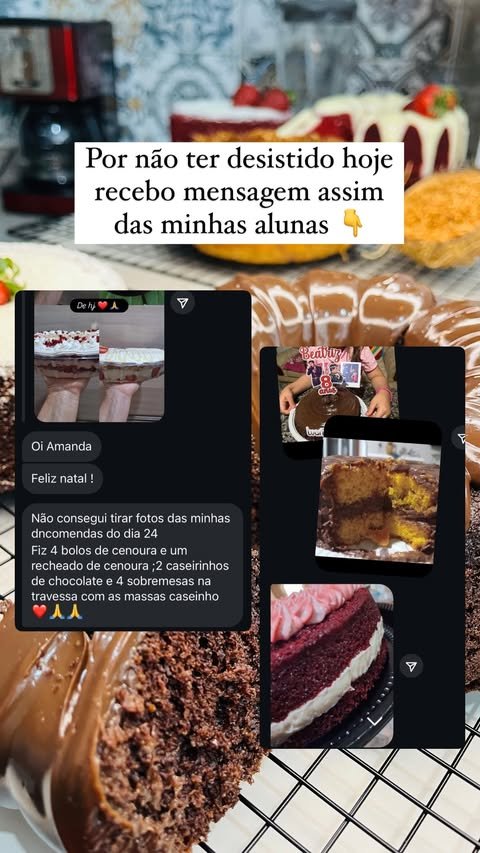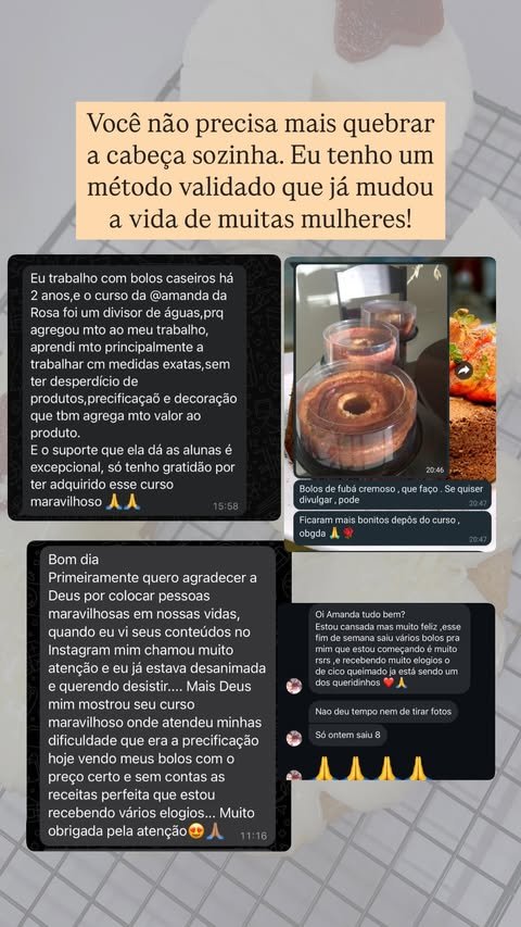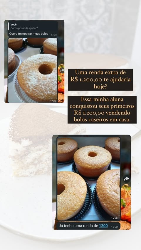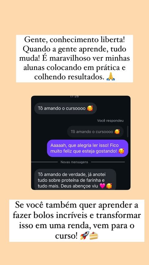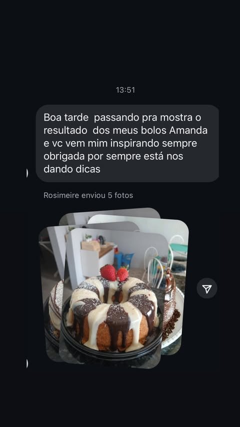 Meu desejo é ajudar mulheres a sair de um momento de luta e desespero financeiro e começar ter a sua liberdade financeira com os meus bolos artesanais, sem sai de casa trabalhando de dentro da sua cozinha começando um negócio extremamente lucrativo e desejado, passando mais tempo com sua família acompanhado o crescimento de seus filhos, e com isso tendo liberdade de tempo e dinheiro.